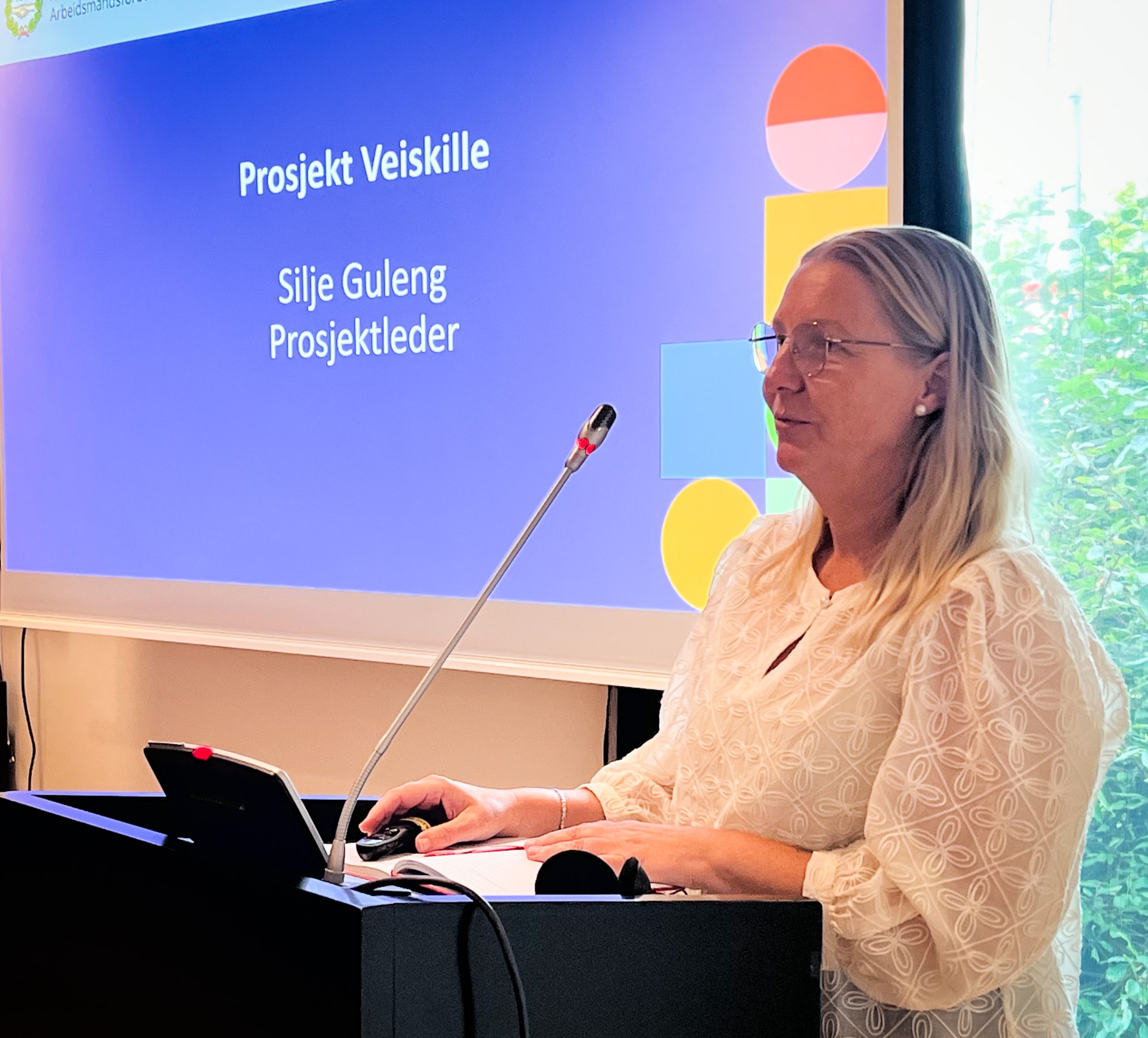 Silje Guleng innledet om Prosjekt veiskille og hva som er målene for neste halvåret. SUN har selv vedtatt å se på hvordan det grønne skiftet påvirker arbeidsplassene innenfor service og tjenester.